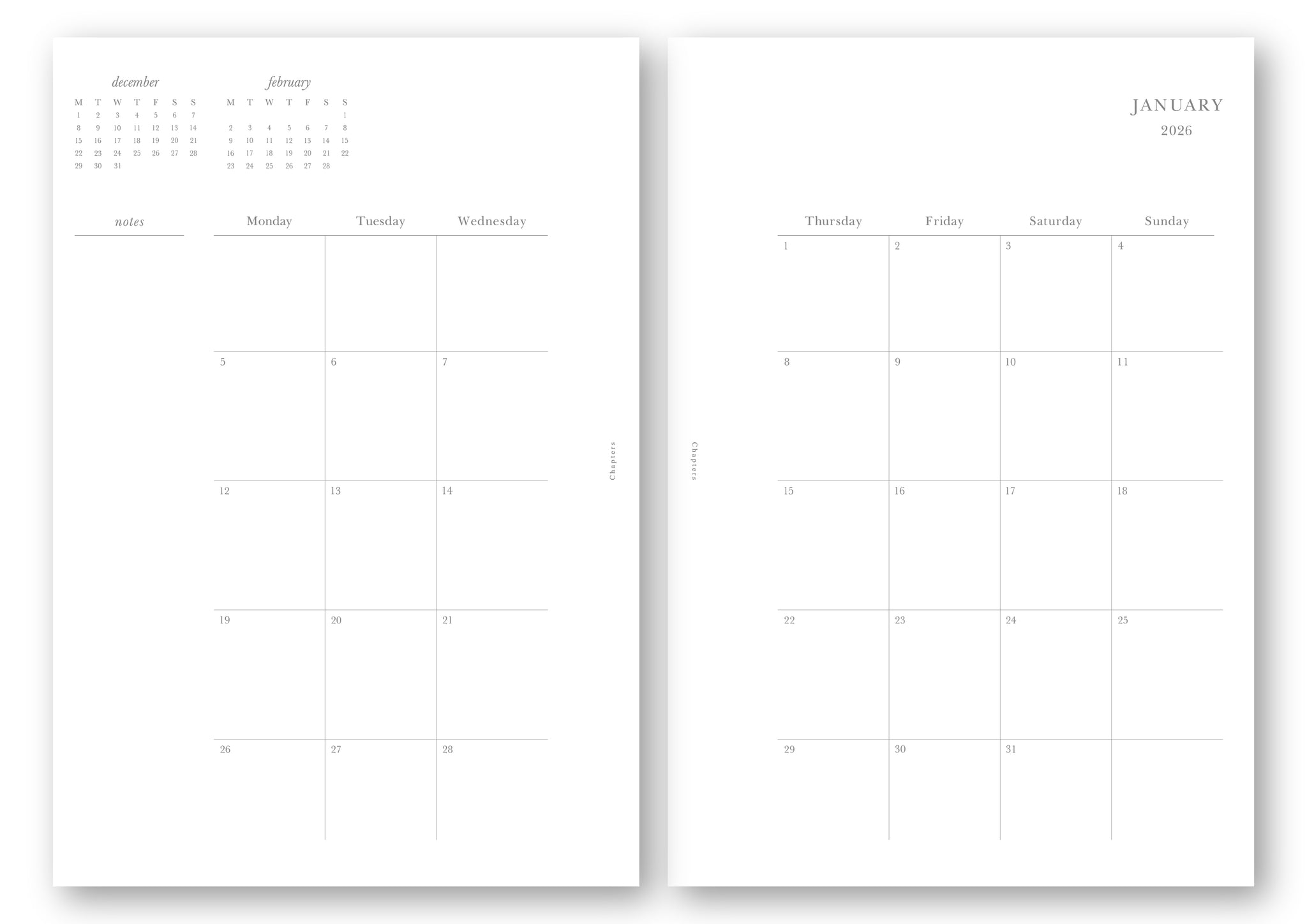 Dimensions: Paper: 13 cm (5,12 in) x 17,5 cm (6.88 in)Features:Pre Punched with 6 holesContents:Personal informationImportant daysCalendar for 2025-202612 month dated plannerTwo days per PageMonthly ViewWeekly View